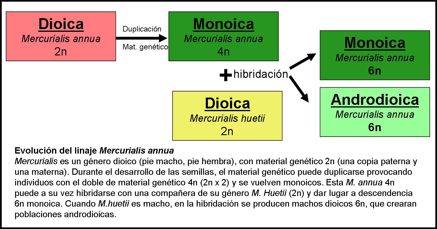 Los caminos de la evolución en esta Mercurialis son inescrutables. Parece que a nuestra protagonista el ambiente le ha puesto difícil renunciar a las ventajas que ambas estrategias ofrecen, y de esta manera ha mantenido ambas en distintas zonas, añadiendo la variante androdioica.