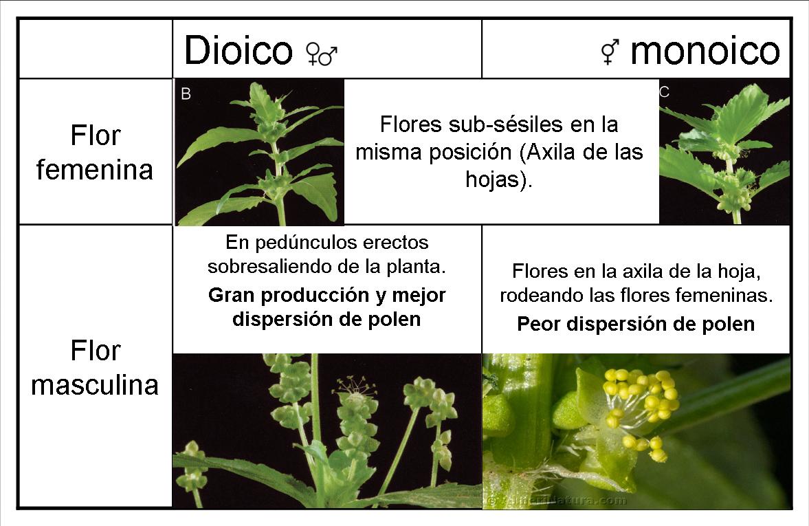 Mercurialis annua es una hierba anual de poco porte que posee individuos con flores femeninas, e individuos con flores masculinas. Son dioicas, como nosotros o como los tejos, que algunos forman las bayas rojas (flores femeninas) y otras no, producen flores pero sin llegar nunca a formar fruto (flores masculinas). Cuando un individuo solo tiene un sexo, su fisiología, morfología, comportamiento etc, se especializa en cumplir las funciones correspondientes a su sexo de la manera más competitiva y eficiente. Este proceso conlleva a acumular diferencias entre sexos, estamos hablando del dimorfismo sexual, al que hace unos meses dedicábamos una entrada en este blog. Las cornamentas de un ciervo aluden a su capacidad de luchar por la pareja, en Mercurialis la posición y morfología floral significan mayor o menor capacidad dispersiva (masculino) y receptora (femenino) del polen (imagen 1).