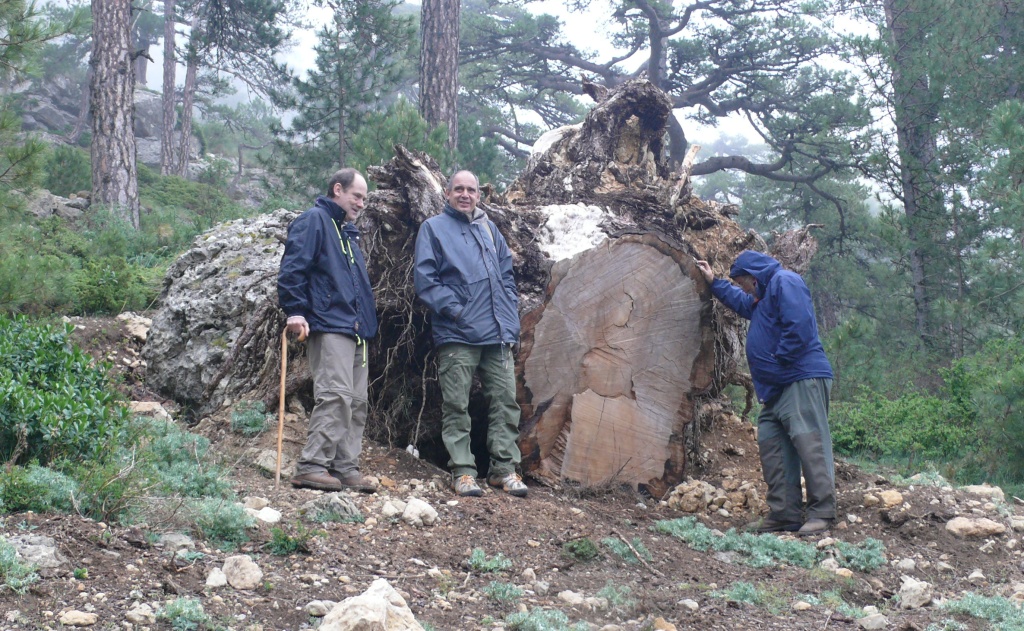 Una de las cosas que se puede leer en la naturaleza son los anillos de los árboles, que es lo que están haciendo los individuos de la fotografía que ilustra este post con un Pinus nigra de Cazorla. Los troncos de los pinos producen todos los años tejido conductor nuevo, que va engordando el tronco. Como crece a saltos se puede diferenciar el crecimiento anual, como se puede ver en la fotografía de abajo. Cuanto crece el tronco depende de cómo le haya ido al pino ese año; si ha habido sequía o ha hecho mucho frío crecerá menos y si el tiempo ha sido bueno crecerá más. Así que midiendo el grosor de los anillos podemos leer el tiempo que hizo en la zona en el pasado, y si el árbol es muy viejo nos podemos remontar a tiempos en los que no había registros instrumentales, que después de todo son bastante recientes (200 años a lo sumo). También podemos ver la frecuencia de perturbaciones como incendios o rayos que ha tenido que sufrir y cuando se produjeron, porque estas perturbaciones dejan cicatrices permanentes en el tronco. Son una lectura muy valiosa para reconstruir el pasado, pero no todos los árboles valen. Hay especies que crecen de forma mucho mas desordenada, como las encinas, que un año no crecen y otro lo hacen tres veces, o que crecen de forma mas constante, como en los trópicos, y apenas se aprecian anillos de crecimiento.