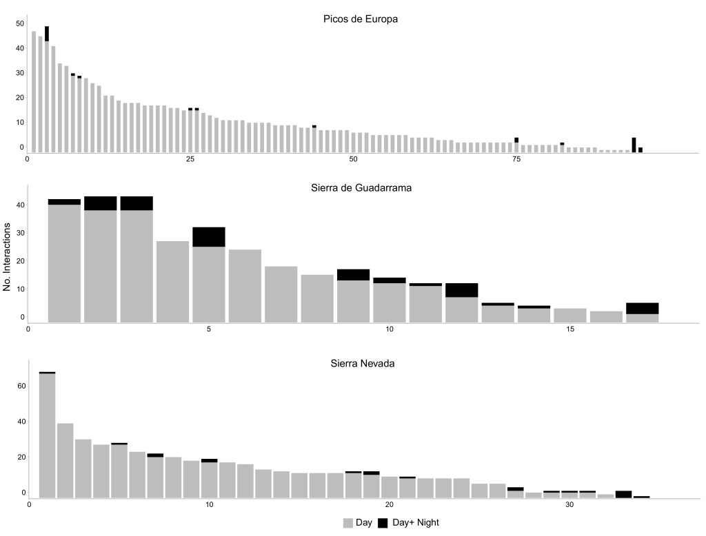 Hemos realizado un estudio con el objetivo de entender si los patrones generales de la red de interacciones que se deducen a partir del estudio de polinizadores diurnos se ven modificados al tener en cuenta también esa parte nocturna que se ha dejado de lado. Para ello, estudiamos las interacciones de polinización en tres zonas de alta montaña, situadas en el norte (Picos de Europa), en el centro (Sierra de Guadarrama) y en el sur (Sierra Nevada) de la Península Ibérica. En cada una de ellas, a lo largo de todo el periodo de floración, se anotaron meticulosamente los polinizadores de cada especie de planta durante el día. Además, se utilizaron trampas de luz por la noche para atraer a las polillas, que se capturaron individualmente para extraer el polen que portaban. Mediante una biblioteca de polen recogido de las plantas de cada zona, se pudo identificar qué especies de plantas habían visitado las polillas. En total, se estudiaron más de 140 especies de plantas y más de 300 polinizadores, con más de 600 horas acumuladas de observación en el campo.
