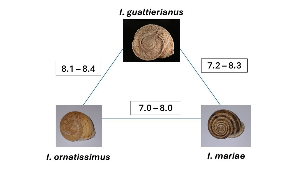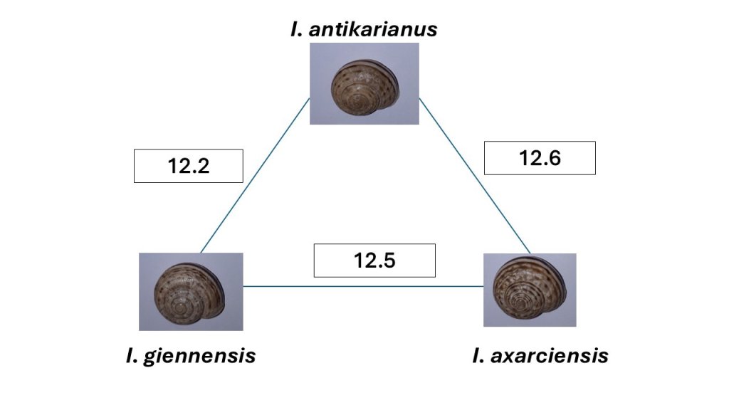 Nuestros recientes estudios muestran, por ejemplo, que existen poblaciones separadas por distancias genéticas superiores al 10%, una distancia genética que justificaría holgadamente considerarlas como especies separadas, pero que apenas se diferencian morfológicamente (Figura 2; Liétor et al. 2024). En cambio, en la Sierra de Gádor coexisten Iberus gualtierianus, Iberus ornatissimus e Iberus mariae, tres “especies” (los taxónomos no terminan de ponerse de acuerdo) con una concha claramente diferenciada (Figura 3), que están separadas por distancias genéticas inferiores al 8.5% (Elejalde et al. 2008b).